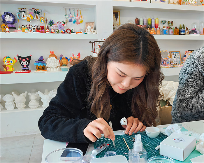 隨后的制作過程中,大家全情投入,充分發(fā)揮想象力和創(chuàng)意進行顏色搭配,將一片片細小的螺鈿片鑲嵌在圖案上,時不時地為顏色搭配凝神思考。經(jīng)過一個多小時的努力,一枚枚精美的胸針就紛紛出爐了。