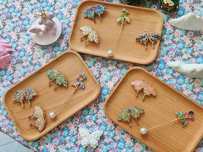 經(jīng)過螺鈿裝飾的胸針,融合了螺鈿本身的迷人色澤與特殊肌理,展現(xiàn)出令人矚目的絢爛色彩與奇幻光澤,在細節(jié)中流露出中式美學的深邃意境,讓人在驚艷之余感受到一種內斂而深沉的美感。